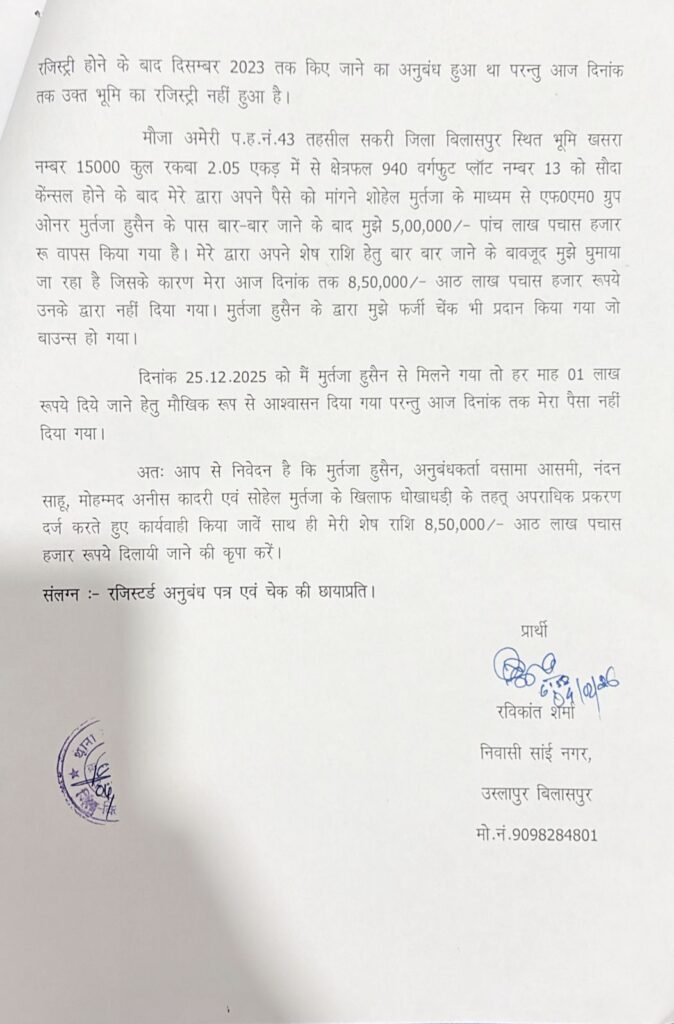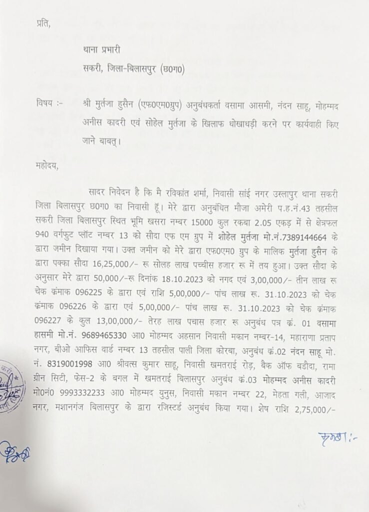 शिकायत के अनुसार, रविकांत शर्मा ने सकरी क्षेत्र के अमेरी पटवारी हल्का अंतर्गत स्थित 940 वर्गफुट जमीन खरीदने के लिए एफएम ग्रुप के संचालक शोहेल मुर्तजा से एग्रीमेंट किया था। आरोपियों ने बताया था कि उक्त जमीन एफएम ग्रुप के नाम पर रजिस्टर्ड है।
